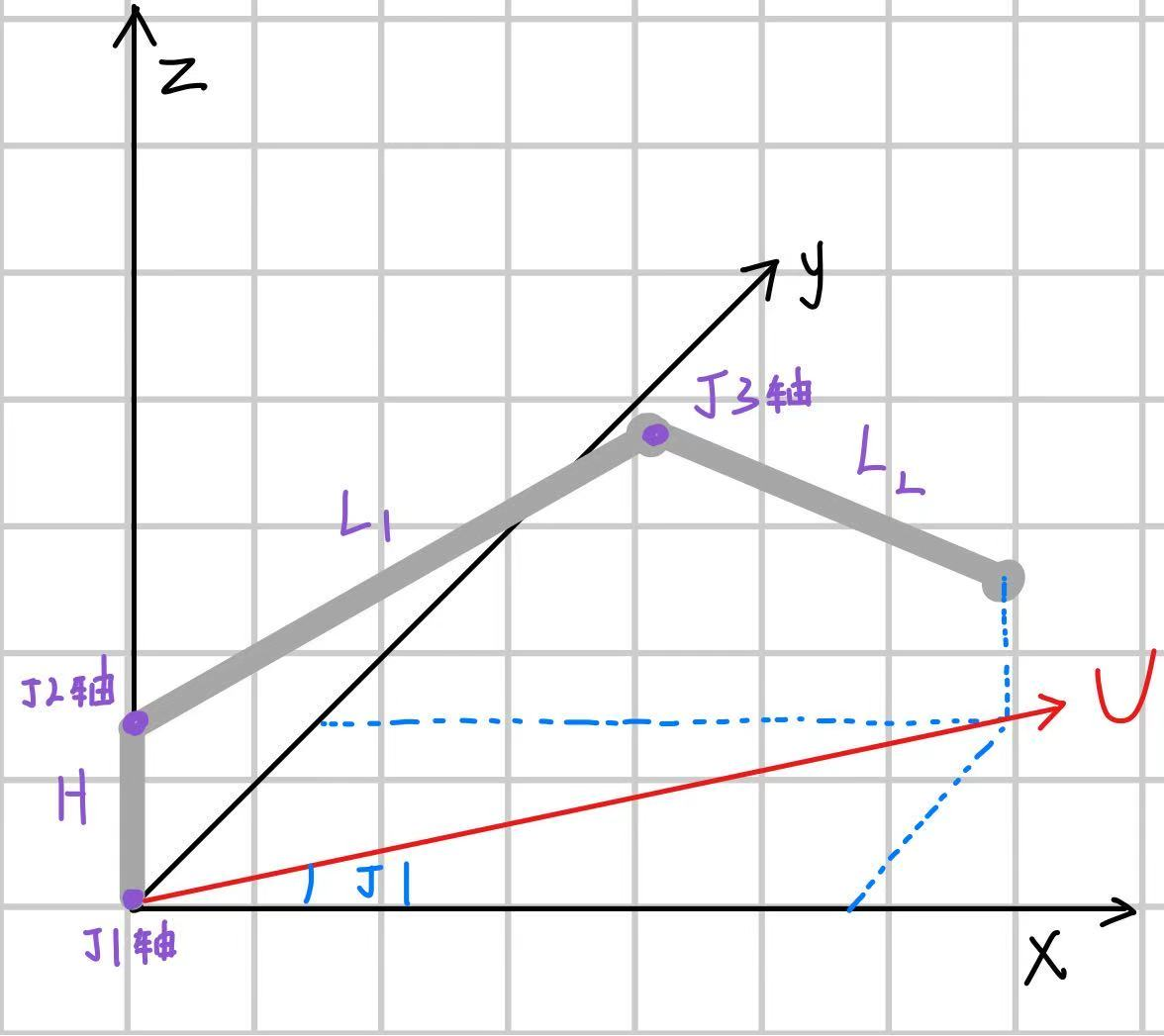 L1(大臂长)、L2(小臂长)、H(J2 的 Z 高度)、目标坐标(X,Y,Z) - 计算