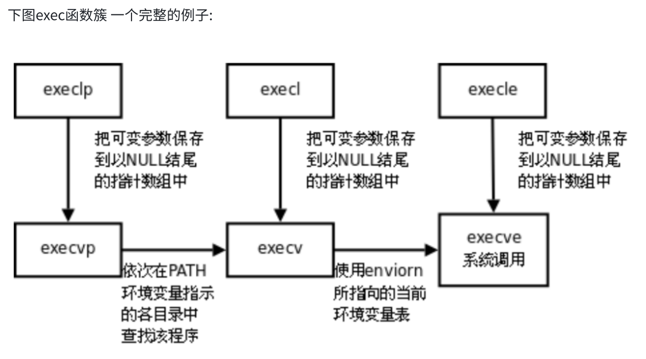 事实上,只有execve是真正的系统调⽤,其它五个函数最终都调⽤execve,所以execve在man⼿册 第2节,其它函数在man⼿册第3节。这些函数之间的关系如下图所⽰。