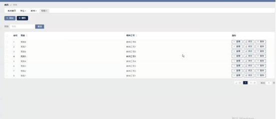 教师管理功能在视图层(view层)进行交互,比如点击“查询、添加或删除”按钮或填写教师表单。这些教师表单动作被视图层捕获并作为请求发送给相应的控制器层(controller层)。控制器接收到这些请求后,调用服务层(service层)以执行相关的业务逻辑,例如验证输入内容的有效性和与数据库的交互。服务层处理完这些逻辑后,进一步与数据访问对象层(DAO层)交互,后者负责具体的数据操作如查看、修改或删除教师信息,并将操作结果返回给控制器。最终,控制器根据这些结果更新视图层,以便教师管理功能允许看到最新的信息或相应的操作反馈。教师管理界面如图5-9所示: