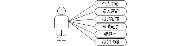 学生:用户进入系统前台,点击个人中心可以对个人中心、修改密码、我的发布、考试记录、错题本、我的收藏等信息进行执行。学生用例如图3-2所示。