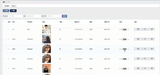 学生管理功能在视图层(view层)进行交互,比如点击“查询、添加或删除”按钮或填写学生表单。这些学生表单动作被视图层捕获并作为请求发送给相应的控制器层(controller层)。控制器接收到这些请求后,调用服务层(service层)以执行相关的业务逻辑,例如验证输入数据的有效性和与数据库的交互。服务层处理完这些逻辑后,进一步与数据访问对象层(DAO层)交互,后者负责具体的数据管理如查看、修改或删除学生信息,并将操作结果返回给控制器。最终,控制器根据这些结果更新视图层,以便学生管理功能可能看到最新的信息或相应的操作反馈。学生管理界面如图5-8所示:
