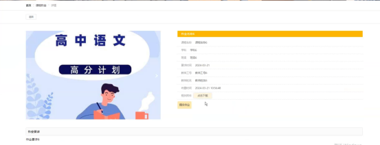 课程作业:在课程作业页面的输入栏中输入作业名称、学科、班级或教师姓名进行查询,可以查看到课程作业详细信息,并进行下载或提交作业操作;课程作业页面如图5-3所示: