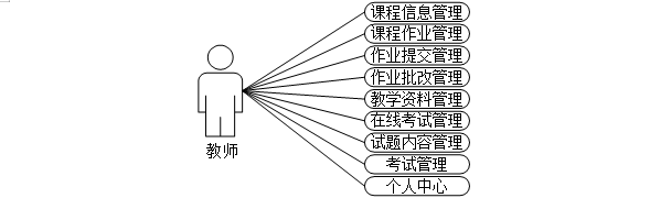 教师:用户进入平台前台,点击个人中心可能对课程信息管理、课程作业管理、作业提交管理、作业批改管理、教学资料管理、在线考试管理、试题内容管理、考试管理、个人中心等信息进行操作。教师用例如图3-3所示。