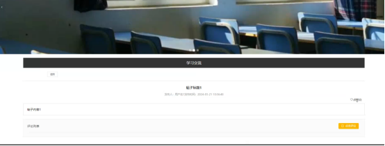 通过学习交流:在学习交流页面的输入栏中输入标题进行查询,能够查看到学习交流详细信息,并进行点赞或评论操作;学习交流页面如图5-4所示: