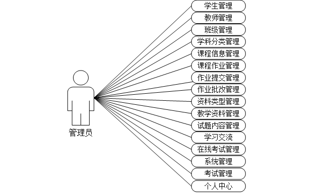 管理员模块:管理员是系统中的核心用户,管理员登录后,可以对后台系统进行管理。主要能力有学生管理、教师管理、班级管理、学科分类管理、课程信息管理、课程作业管理、作业提交管理、作业批改管理、资料类型管理、教学资料管理、试题内容管理、学习交流、在线考试管理、系统管理、考试管理、个人中心等特性。管理员用例如图3-1所示。