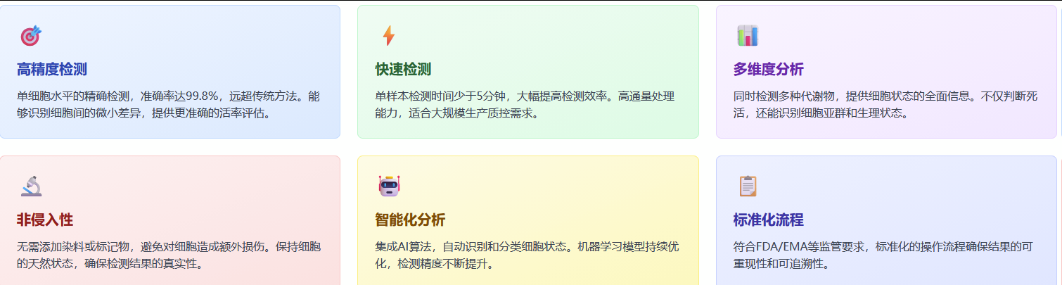 传统的细胞活率检测办法如台盼蓝染色、MTT检测等,虽然操作简便,但只能提供群体水平的平均信息,无法反映细胞间的异质性。而CytMS™技术借助检测单个细胞的代谢指纹图谱,能够识别出处于不同生理状态的细胞亚群,为细胞治疗产品的质量评估提供更加精确和全面的信息。