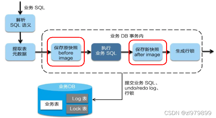 - 执行“业务 SQL”更新业务数据,在业务数据更新之后,将其保存成“after image”,最后生成行锁