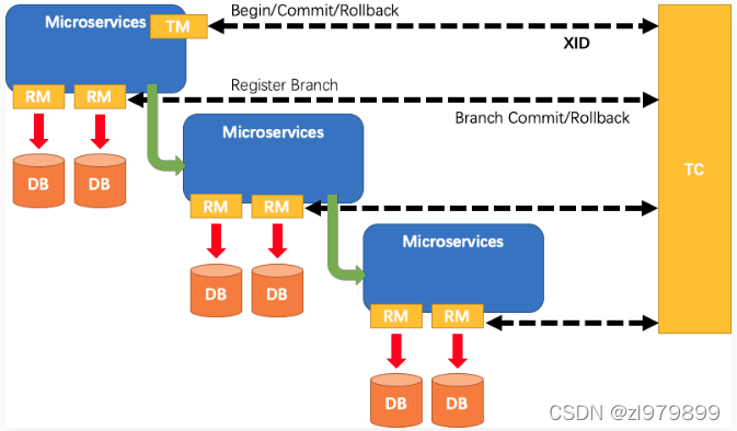 - TM 向 TC 申请开启一个全局事务,全局事务创建成功并生成一个全局唯一的 XID