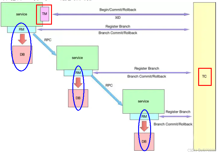 - Resource Manager (RM):资源管理器,即代表数据库,负责管理分支事务上的资源,向TC注册分支事务、汇报分支事务状态,并接收TC事务协调器的指令,驱动分支(本地)事务的提交和回滚