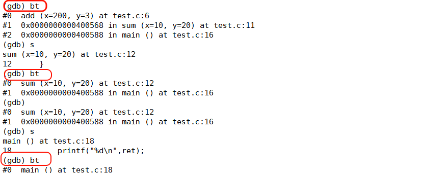 bt(例如输入 bt,查看当前程序的函数调用栈,包括各级函数的调用关系、参数和返回地址等)