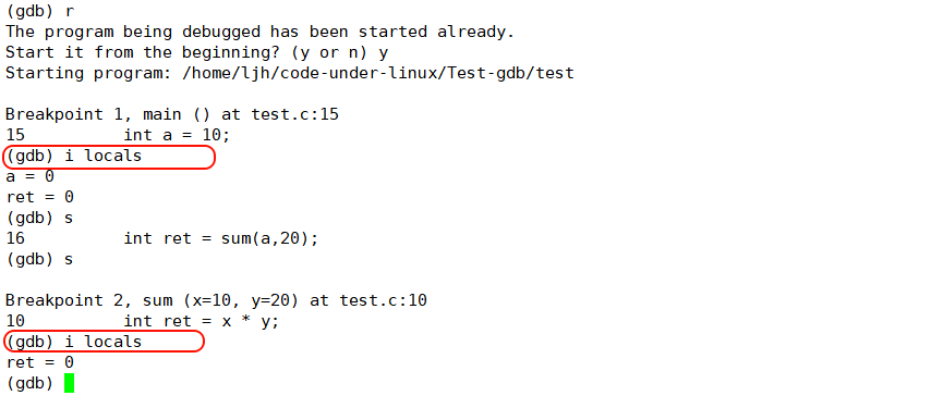 info locals(或i locals,例如输入info locals,查看当前栈帧中所有局部变量的名称和值)