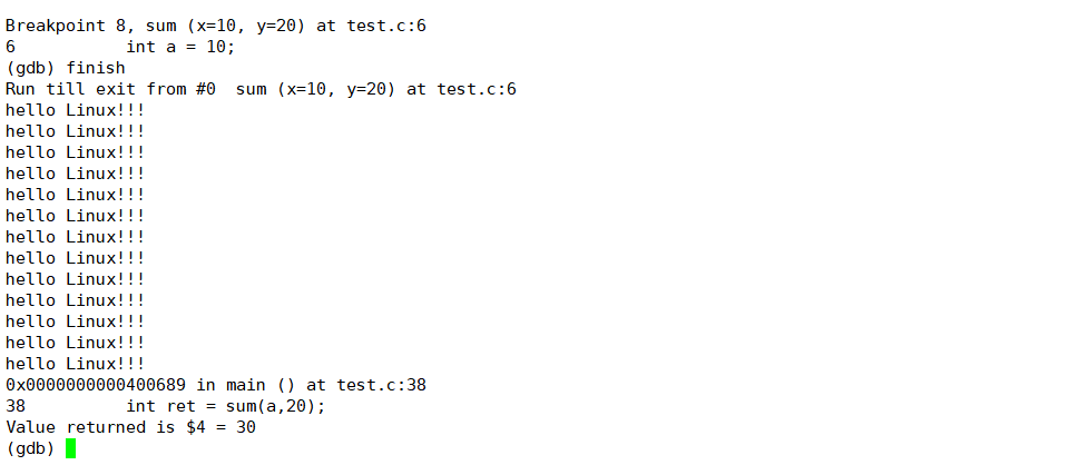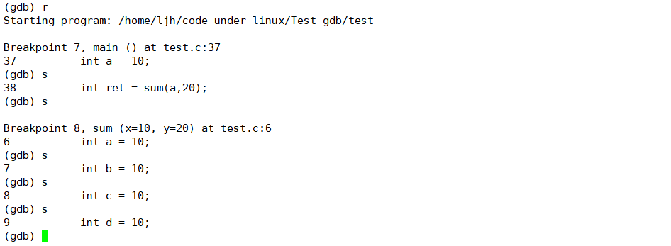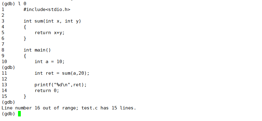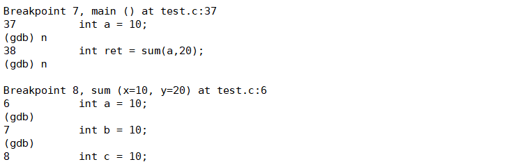 break test.c:sum(或b test.c:sum),会在test.c文件的sum函数开头设置断点。- 在 GDB 中如果不指定文件名,