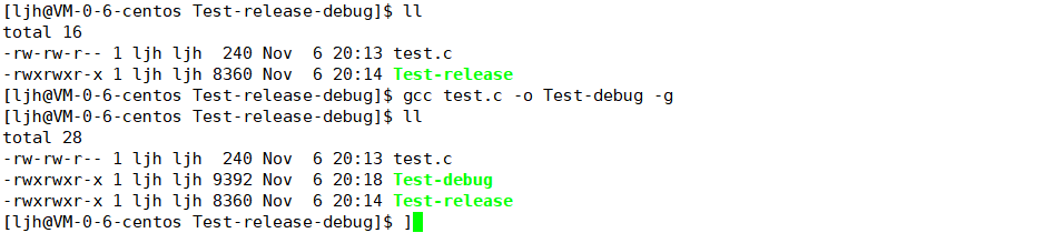 可以看到两次编译后的文件大小不同,那么带 "-g" 选项编译后的可执行程序多了什么呢?
