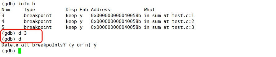 第一个指令是删除序号为3的断点,第二个指令是删除所有断点,Num下的编号就对应了每个断点的序号
