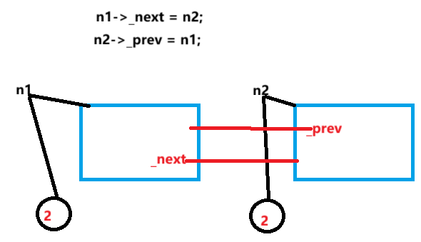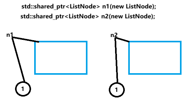 ①首先创建了两个shared_ptr指针对象n1、n2管理两个节点,此时n1、n2引用计数均为1;