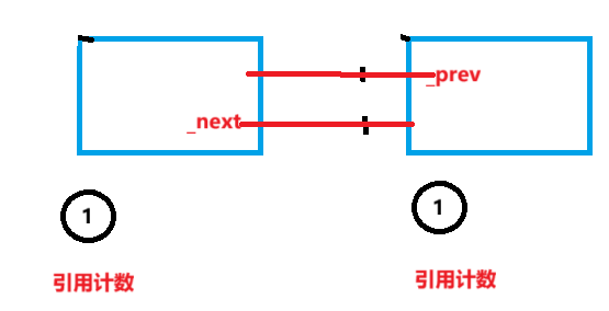 ②让它们互相指向,此时由于_next与_prev的类型也是shared_ptr,所以引用计数都加1;