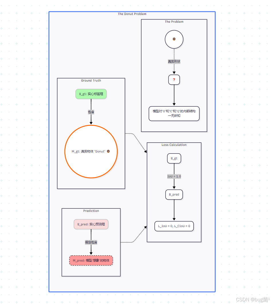 甜甜圈问题:我们揭示了Bbox回归的根本局限——拟合“框”(Container)而非“物”(Content)。L I o U = 0 L_{IoU}=0LIoU=0不等于“完美”预测。