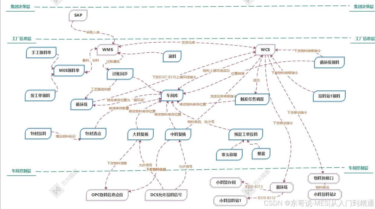 集团决策层(SAP系统)、工厂信息层(MES/WMS)和车间控制层(PLC/DCS)。