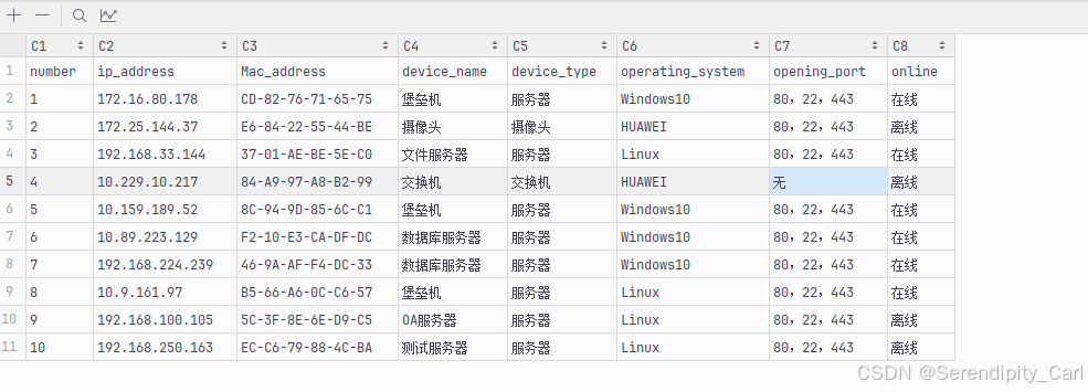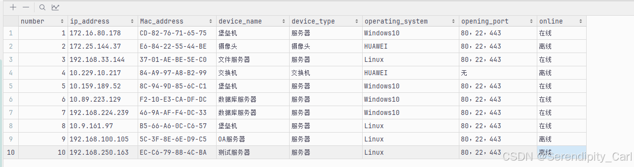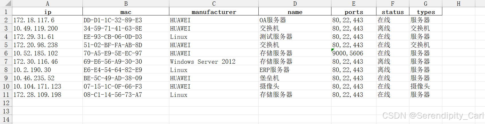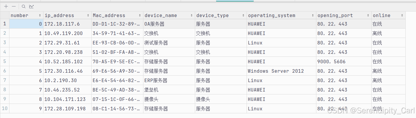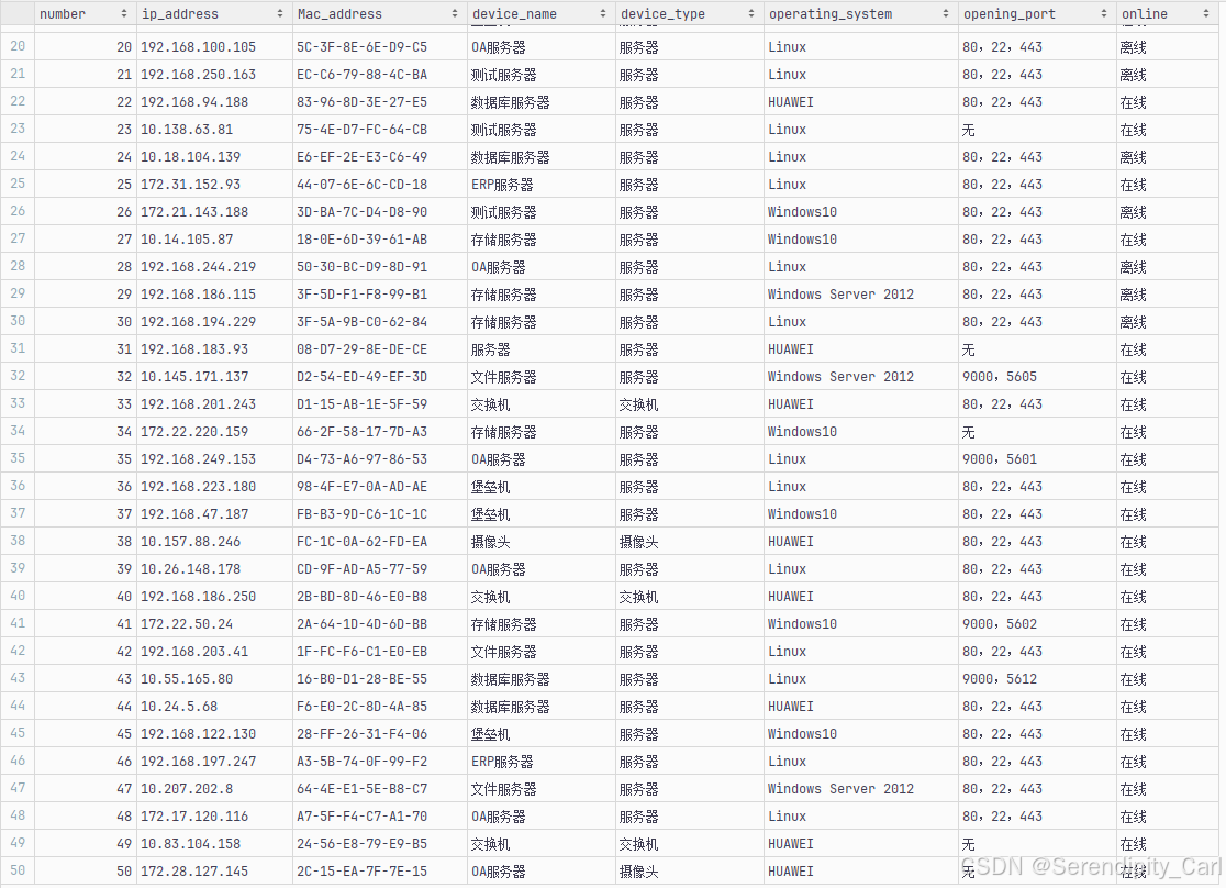 all_data = f'{number},{ip_address},{Mac_address},{device_name},{device_type},{operating_system},{opening_port},{online}\n'