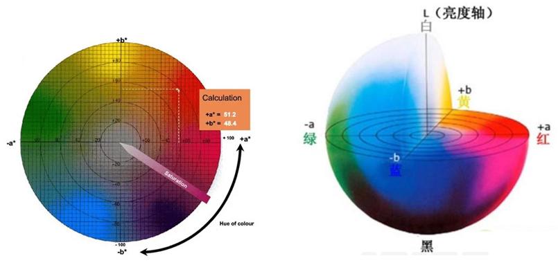 色差仪Lab数值的含义相对来说比较简单,主要包含三个维度(具体的颜色空间可以参考下图):