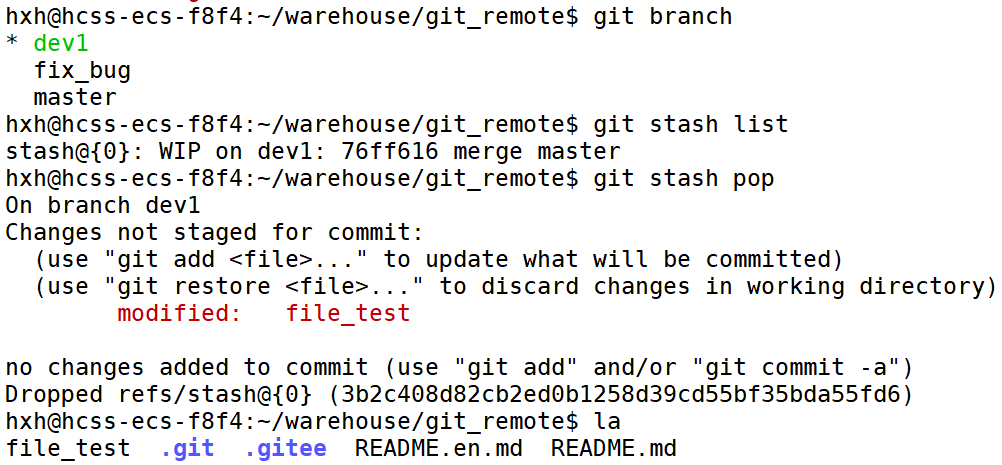 bug修好之后,返回dev2分支中进行开发,使用git stash list----可查看stash里保存了哪些文件,启用git stach pop-----从stash文件中拿出来。