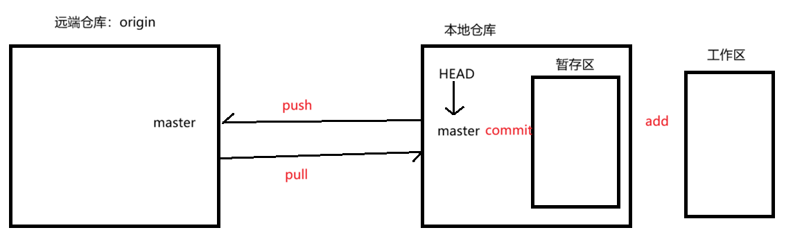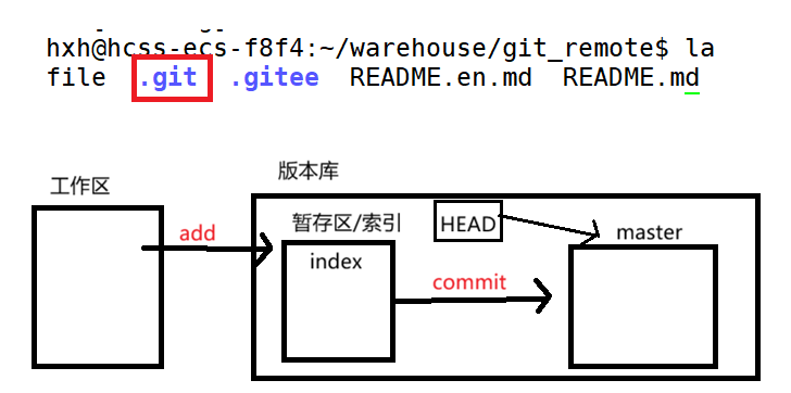 工作区---(经过add操作)-->暂存区/索引-----(commit -m)----->仓库。