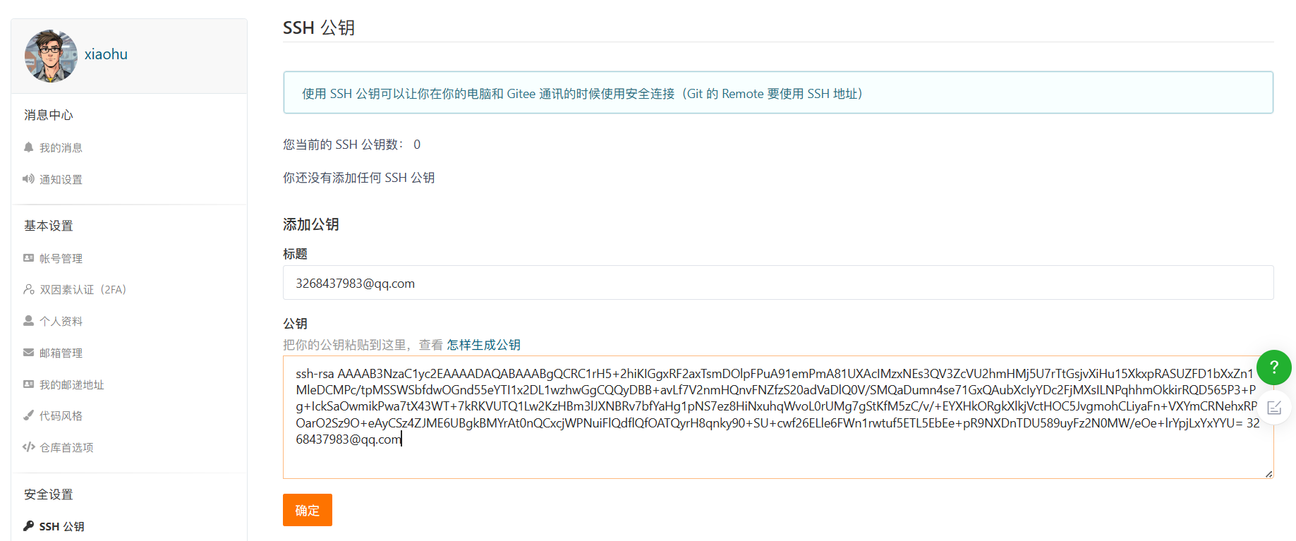 注意使用ssh的方式进行克隆的时候,要求先在本地的.ssh目录下查看是否有id_rsa和id_rsa.pub这两个档案,假设有了就可以拿到id_rsa_pub中的公钥,如果没有需要配置一下:使用ssh-keygen -t rsa -C 【"3268437983@qq.com"】-------括号中代表你的邮箱地址。之后再到.ssh目录下查看有没有id_rsa和id_rsa_pub文件。