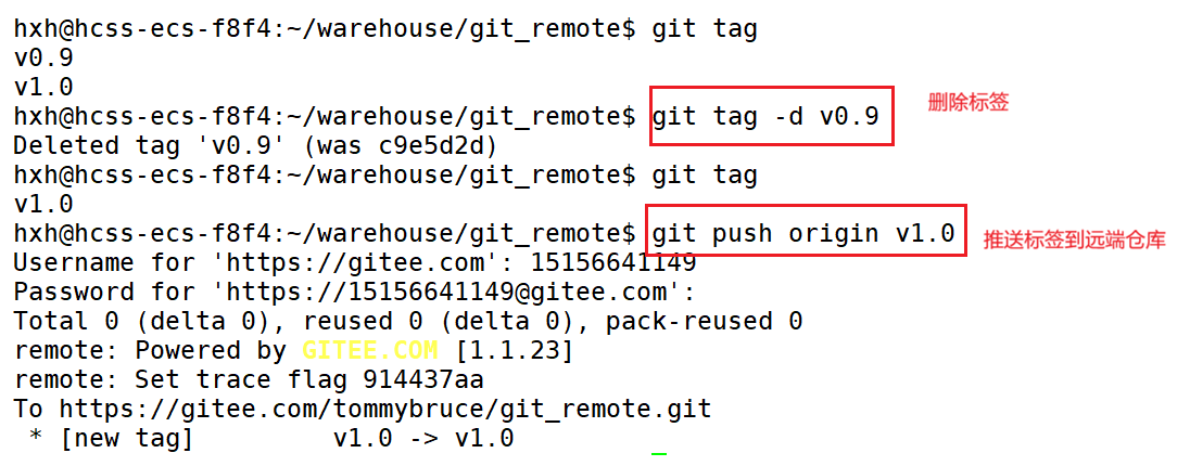 删除远端的标签:1)git tag -d v1.0先删除本地 2)git push origin :v1.0 再推送到远端。