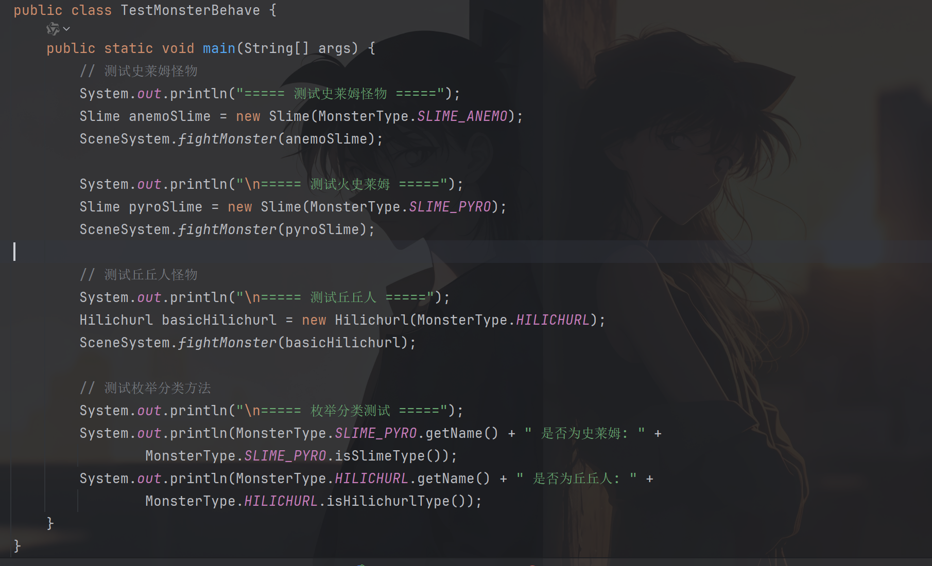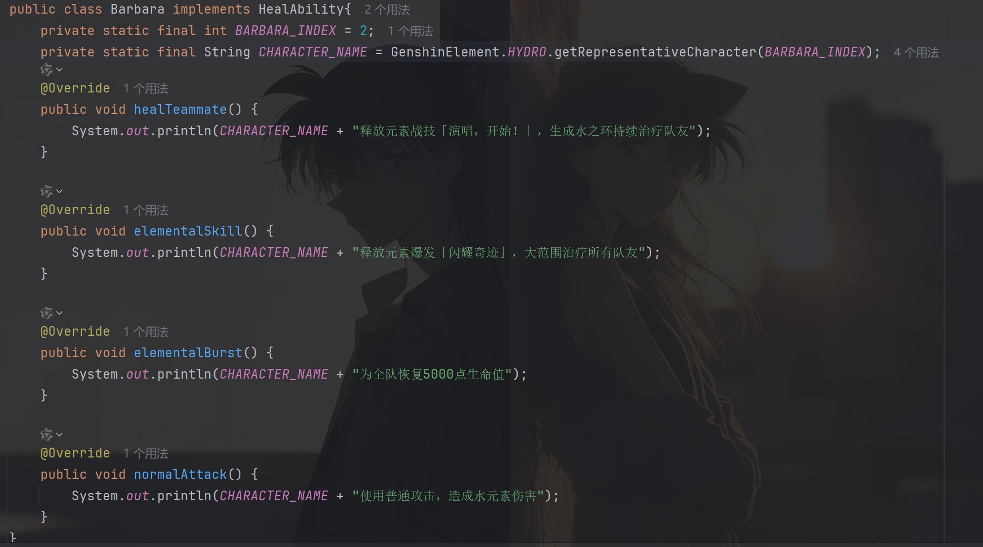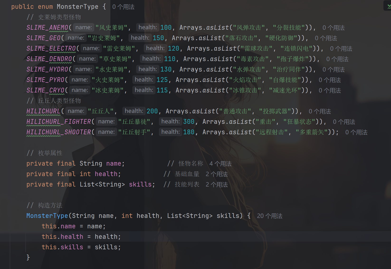 步骤 4:枚举常用的角色信息(目的:接口定义了角色 “要做什么”(技能行为),枚举则封装角色 “基础信息”(比如元素类型、星级),两者搭配实现 “行为规范 + 属性标准化”,避免硬编码角色名称 / 属性导致的错误)