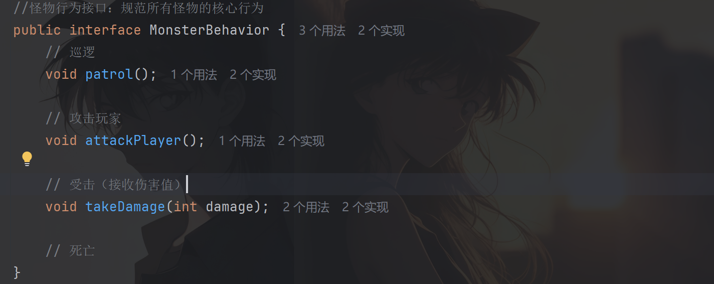 步骤1:定义怪物行为接口(目的:为所有怪物制定“核心行为标准”,确保巡逻、攻击、受击、死亡等核心逻辑不遗漏)