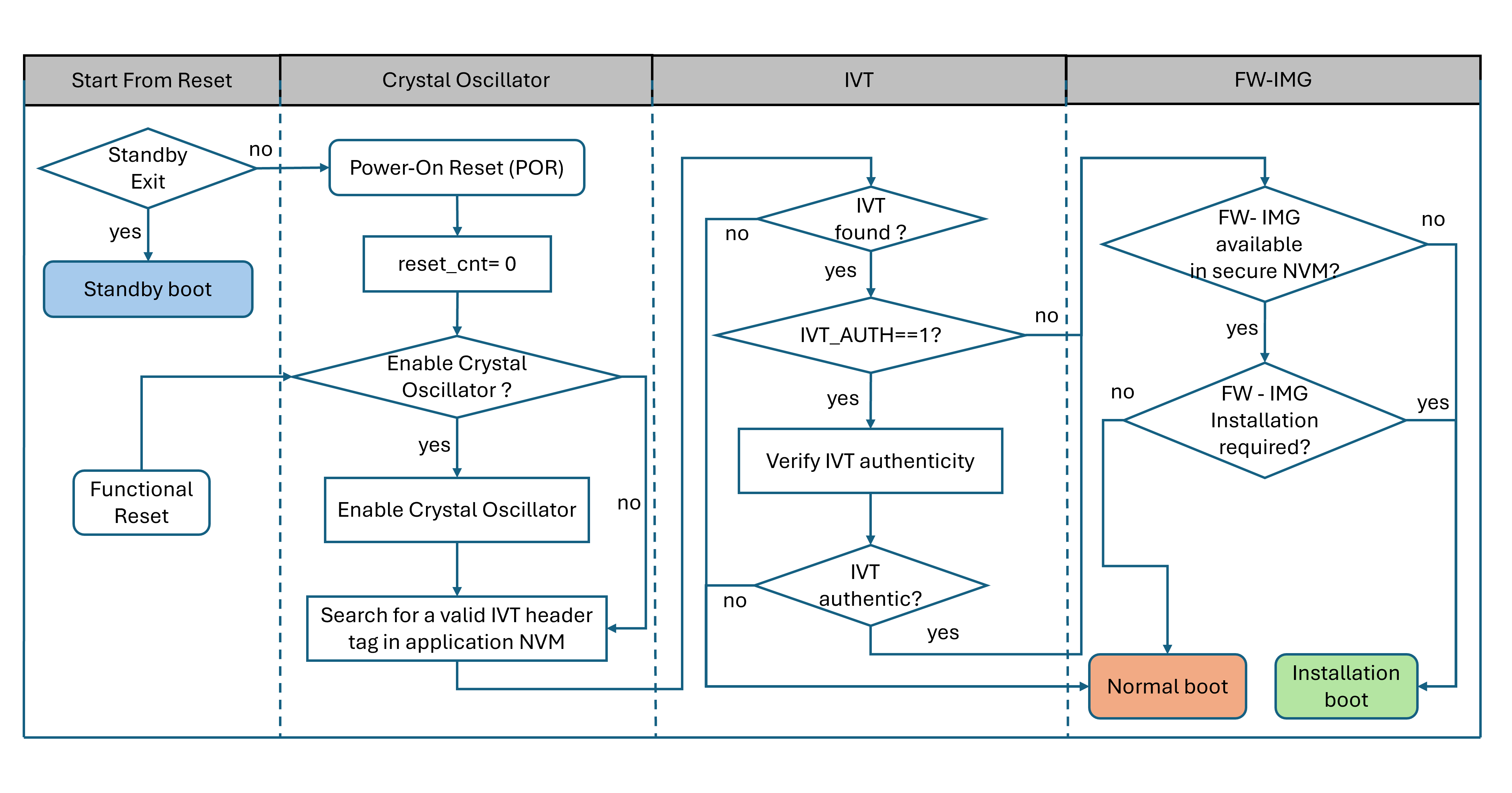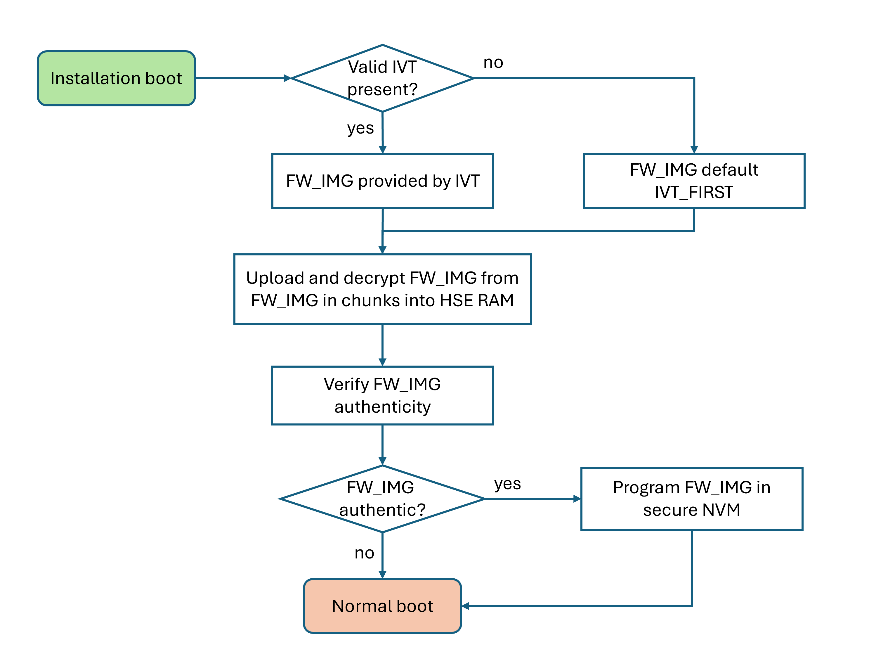在Installation boot阶段,HSE从Applicaiton NVM中读取加密的FW-IMG,进行解密并且存储在受保护的系统RAM中。如果该解密的文件经过了真实性验证,HSE系统将其写入code flash中,同时将RAM中的内容删除。