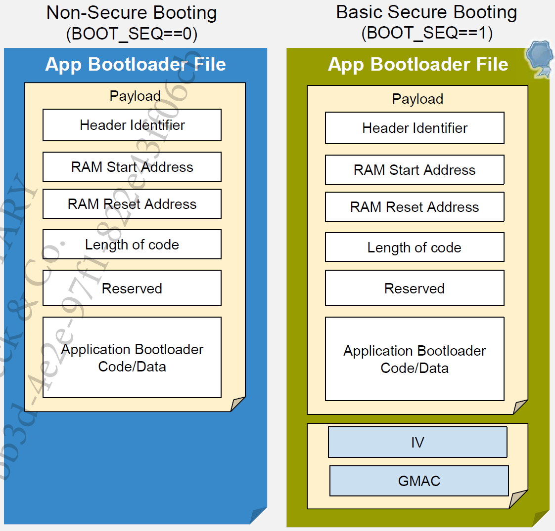 Application Bootloader有两种方式加载,一种是通过BootROM(Non-Secure boot)或HSE FW(Secure boot)通过。App Bootloader能够借助HSE的hseBootDataImageSignSrv_t的服务生成GMAC值,将生成的随机的IV和tag值存储在App Bootloader文件的结果,如下图所示: