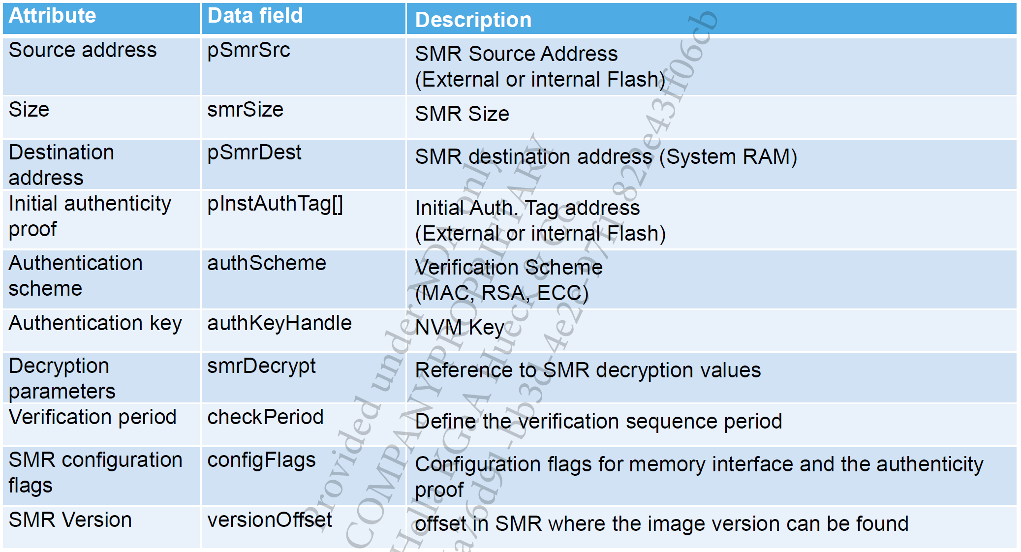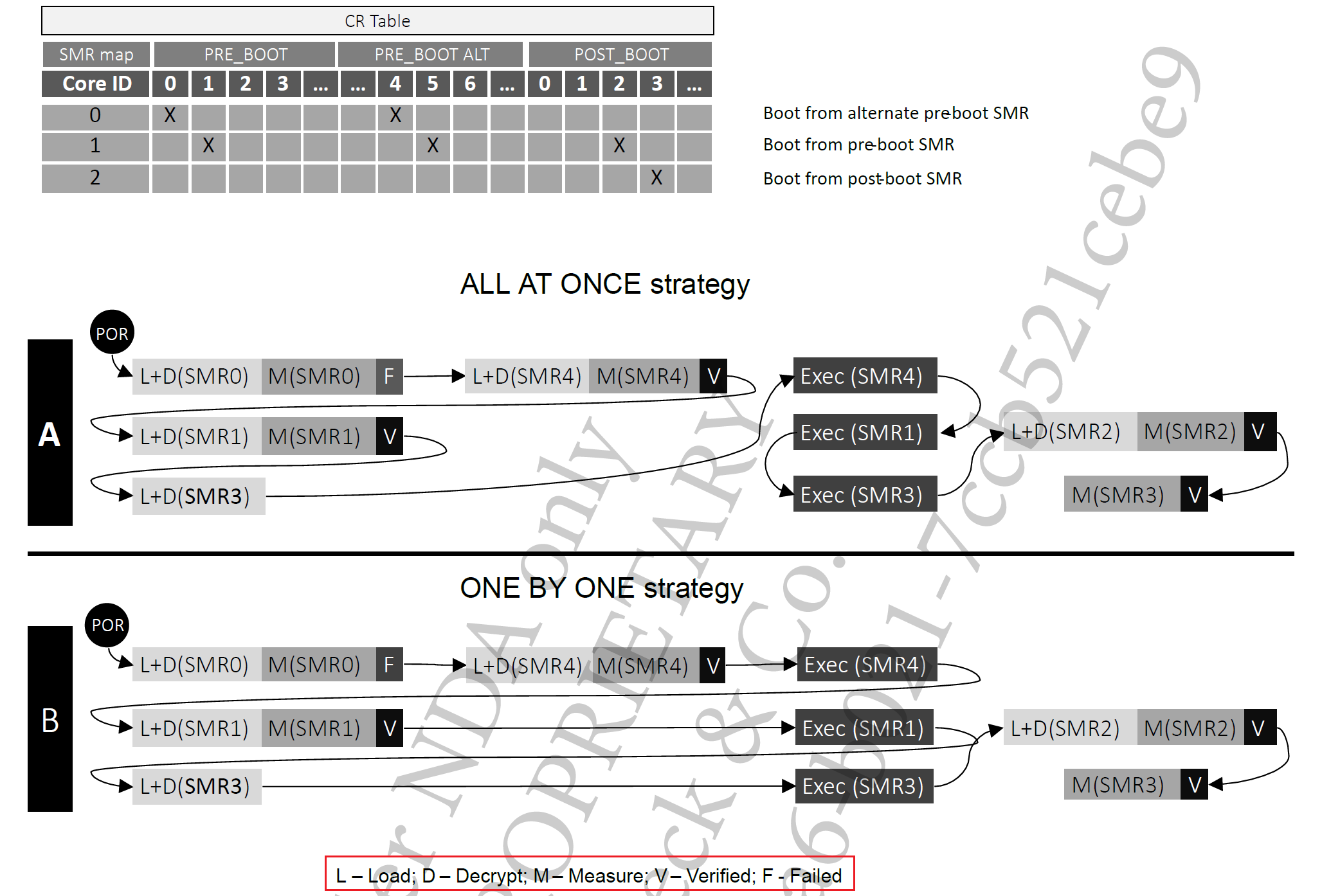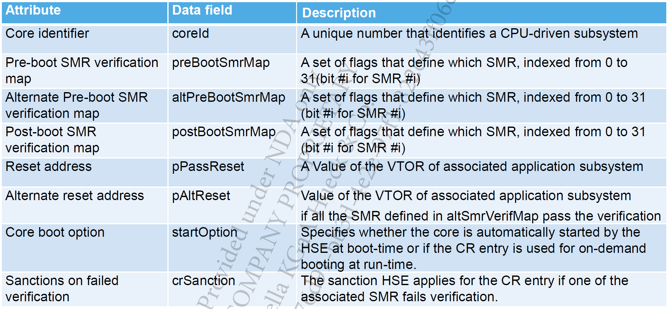 在Pre-boot阶段,HSE从CR table的第一个入口索引开始进行解析。对于每个一个CR的入口,通过pCrEntry->PreBootSmrMap链接的SMR区域被验证。若是任意SMR验证失败,那么HSE开始验证通过pCrEntry->altPreBootSmrMap链接的SMR区域。