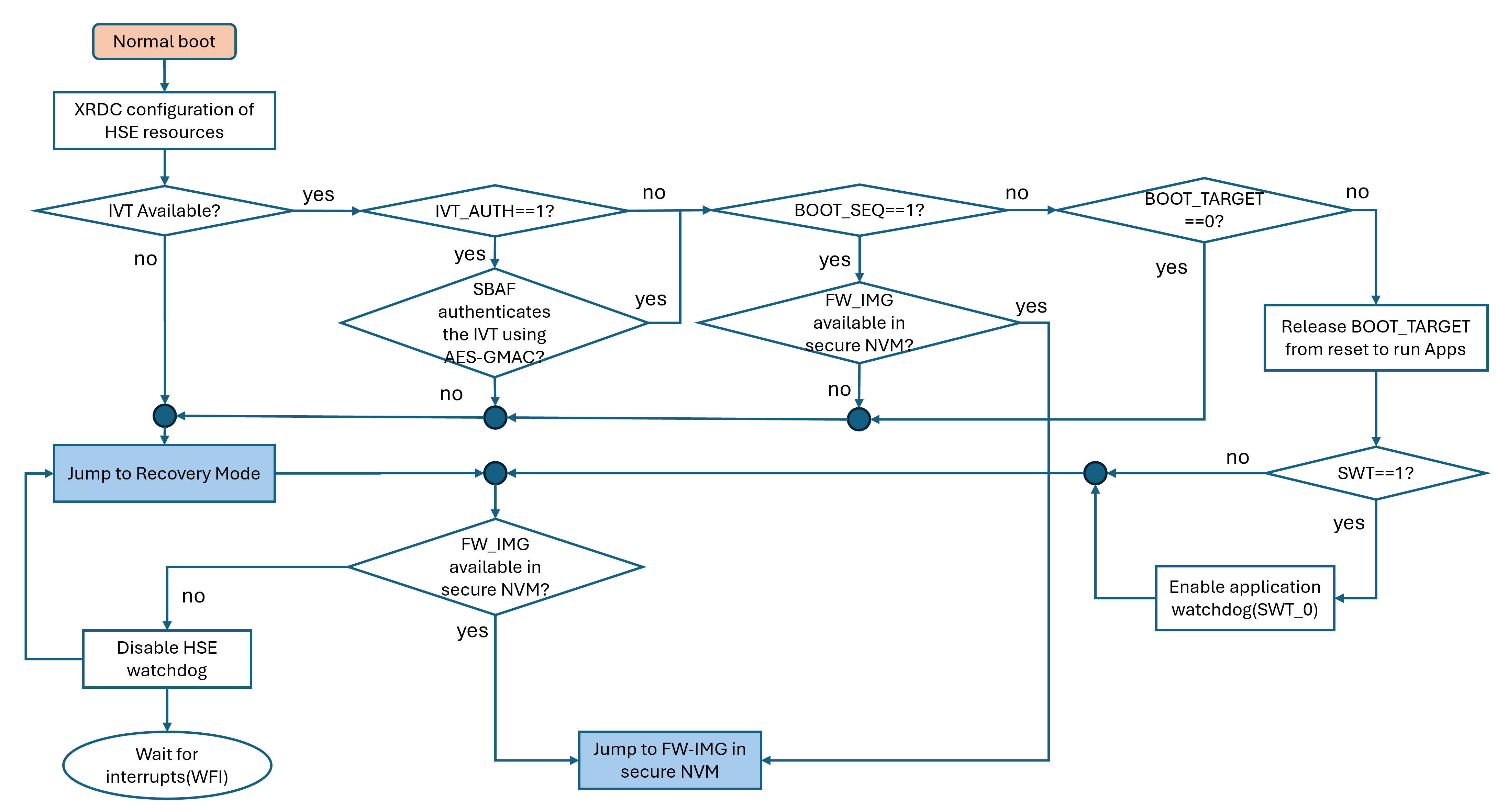 如果secure NVM中存在HSE固件,那么最终会运行HSE,其他情况则进入wait-for-interrupt模式(WFI)