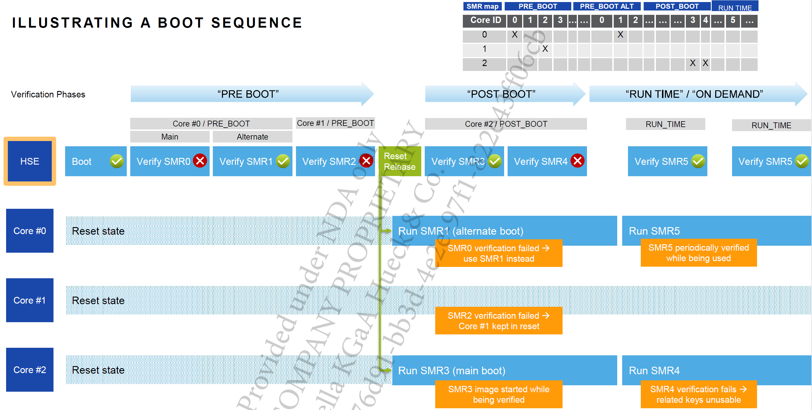 假如pre-boot阶段的SMR区域验证成功,HSE开始启动CPU子系统,具体的启动策略参考core reset release strategies