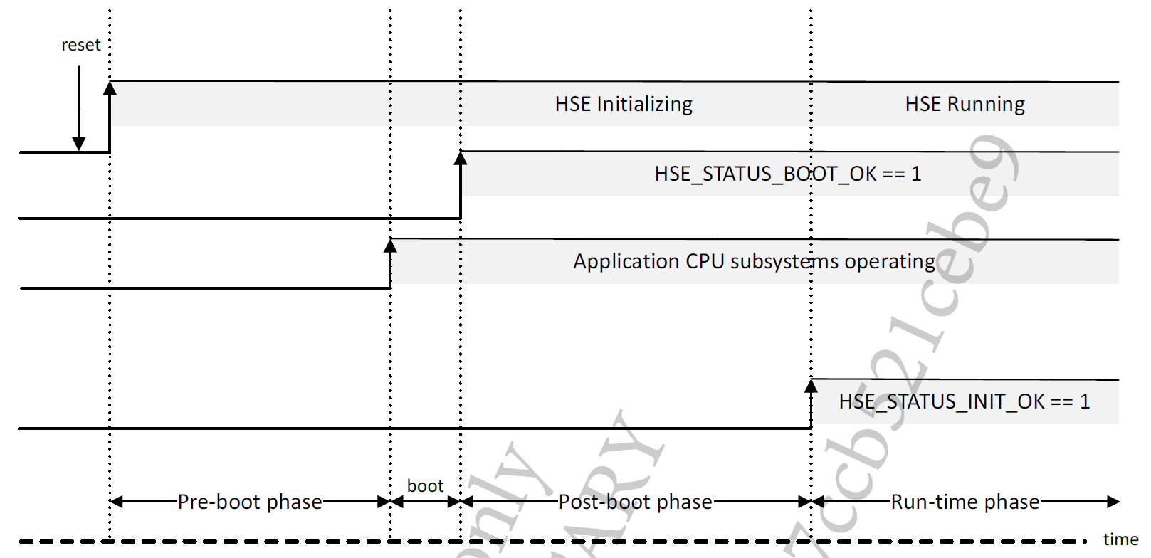 Pre-boot和Boot阶段结束时,所有已配置的CPU子系统都被启动,HSE通过状态标志HSE_STATUS_BOOT_OK来通知。