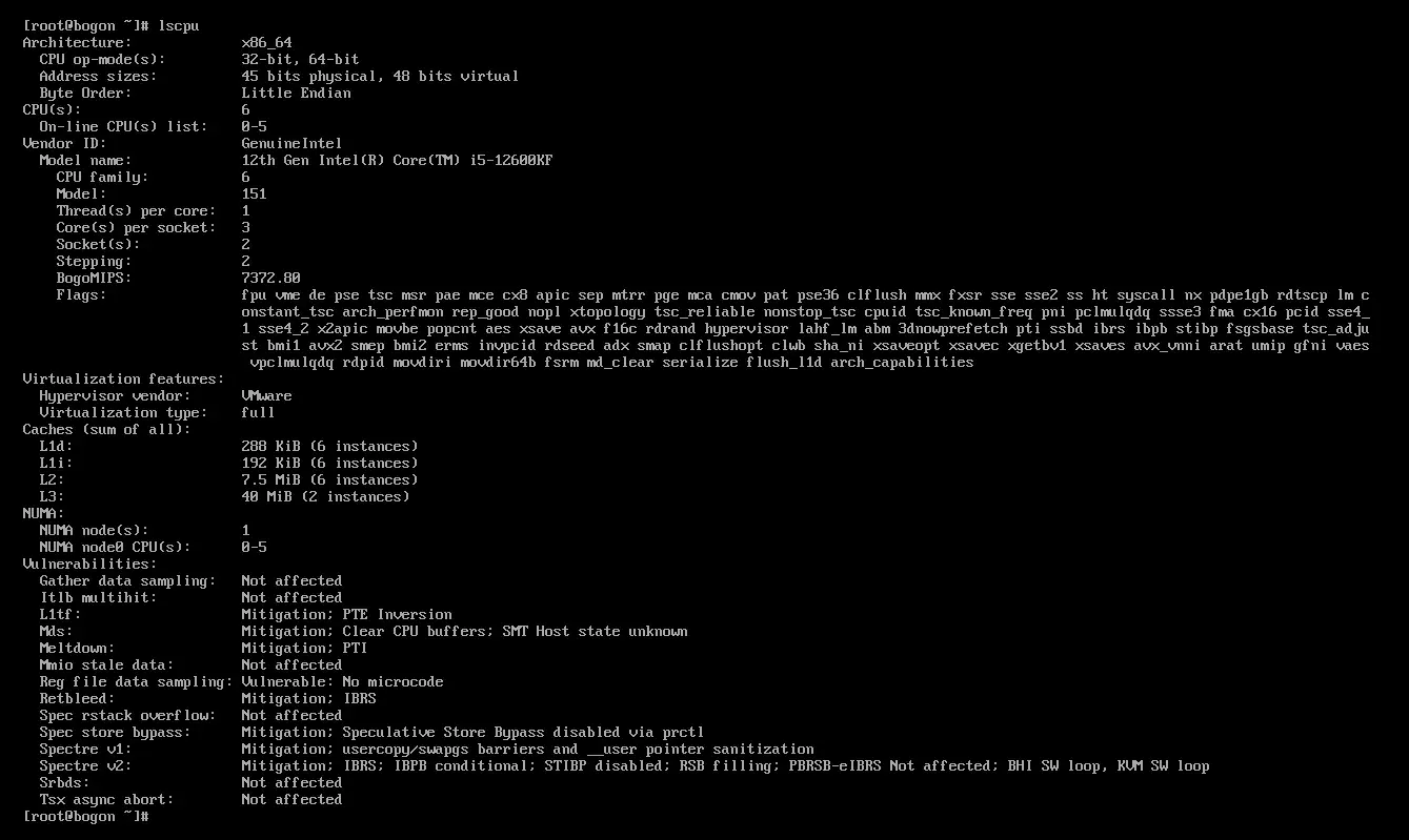 重点关注:“CPU(s)”(核心数)、“Architecture”(架构),确保和虚拟机配备一致。我实测表明6核x86_64架构,符合预设。