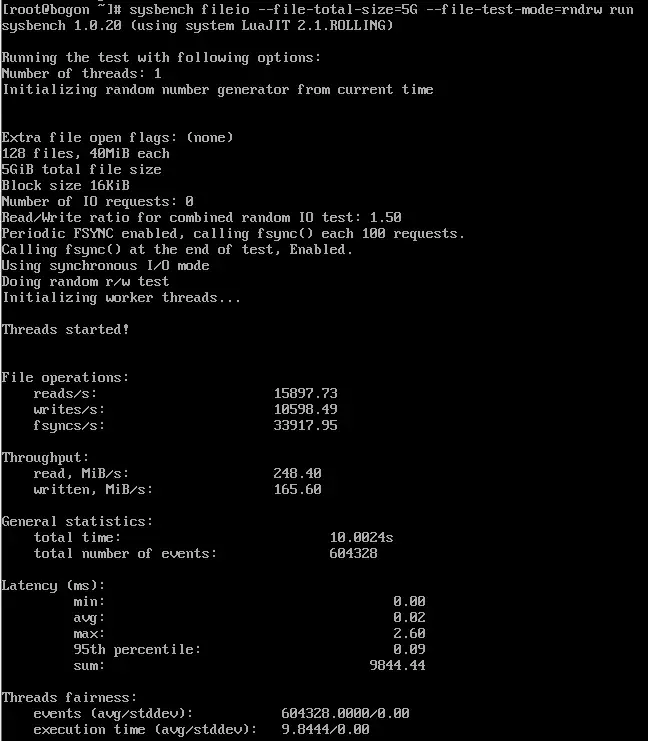 核心测试指令:sysbench fileio --file-total-size=5G --file-test-mode=rndrw run