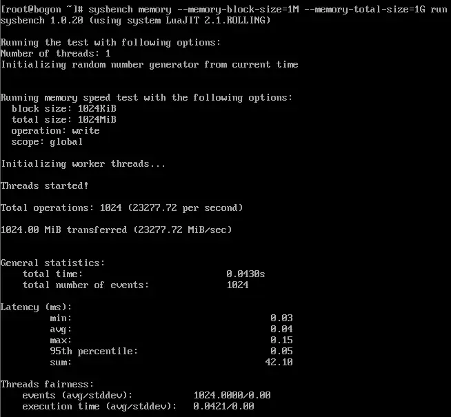 核心测试指令:sysbench memory --memory-block-size=1M --memory-total-size=1G run