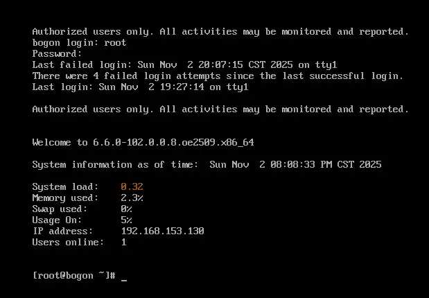 - 性能基准数据:内核版本"6.6.0-102.0.0.8.oe2509.x86_64"带"oe2509"标识,证明是基于优化思路打造的企业级内核;环境负载0.32、内存使用率2.3%,说明环境纯净无干扰,测性能数据更准;IP地址192.168.153.130记好,后面安全测试要用它当目标靶标