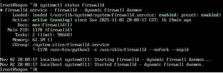前置核查指令(openEuler端):systemctl status firewalld,表现“active (running)”即为正常启动
