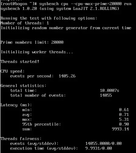 核心测试指令:sysbench cpu --cpu-max-prime=20000 run