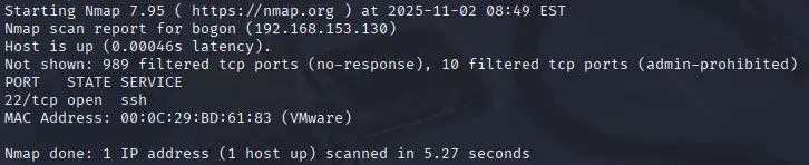 实测结果:nmap显示989个端口被过滤,仅22端口(SSH默认端口)开放。原生防火墙精准拦截未授权端口,攻击端无漏洞可乘,防御体系完全生效。