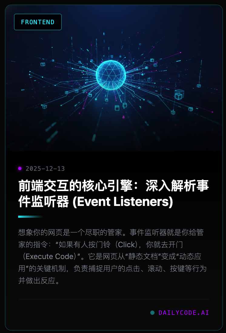 在 Web 1.0 时代,网页主要用于展示静态信息。而随着 JavaScript 的引入,网页开始具备了“生命”。赋予网页这种生命力的核心机制,就是事件监听器 (Event Listeners)。
