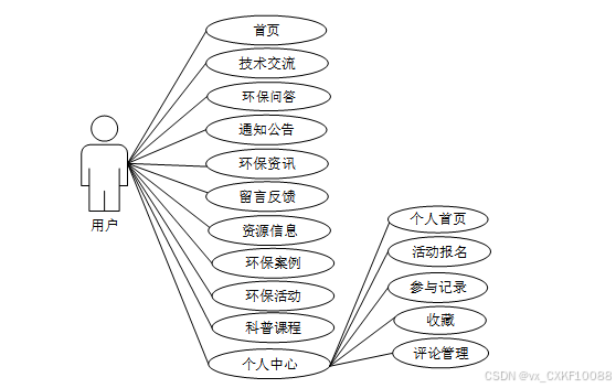 普通用户用例图展示了普通用户在资源与环境保护网站上的主要功能和处理流程。该用例图重要涵盖了用户在平台上进行信息浏览、互动、学习和参与活动的各项功能。普通用户可以凭借首页浏览网站内容,参与技术交流和环保问答,查看环保资讯和通知公告,参与环保活动,并报名科普课程。此外,用户还可以在个人中心管理个人信息、查看参与记录、收藏内容及管理评论等。普通用户用例图如下所示: