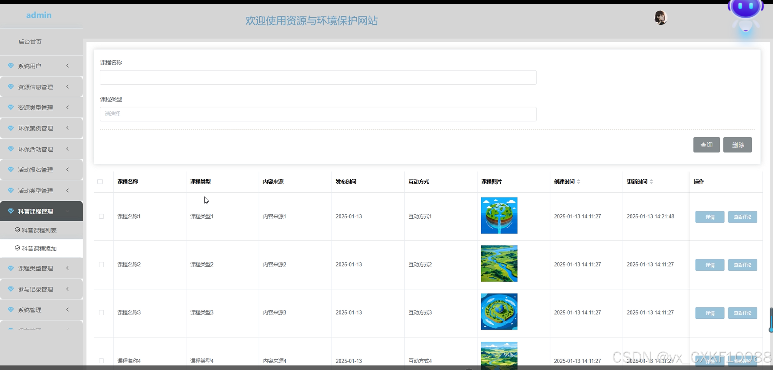 通过科普课程管理界面为管理员提供了对环保科普课程的全面管理能力。科普课程列表展示了所有已发布的科普课程,包括课程名称、课程内容、讲师等信息,管理员行轻松查看每个课程的详细内容。科普课程添加效果允许管理员新增课程,填写课程名称、简介、讲师信息、课程内容等,丰富课程库。管理员还可以通过查询功能根据关键词快速找到特定课程,进行精准管理。删除功能则允许管理员删除不再需要的课程,确保信息的更新和管理的高效。每个课程下都有查看评论功能,管理员能够查看用户对该课程的评价和反馈,协助优化课程内容和教学质量。科普课程管理界面如下图所示。