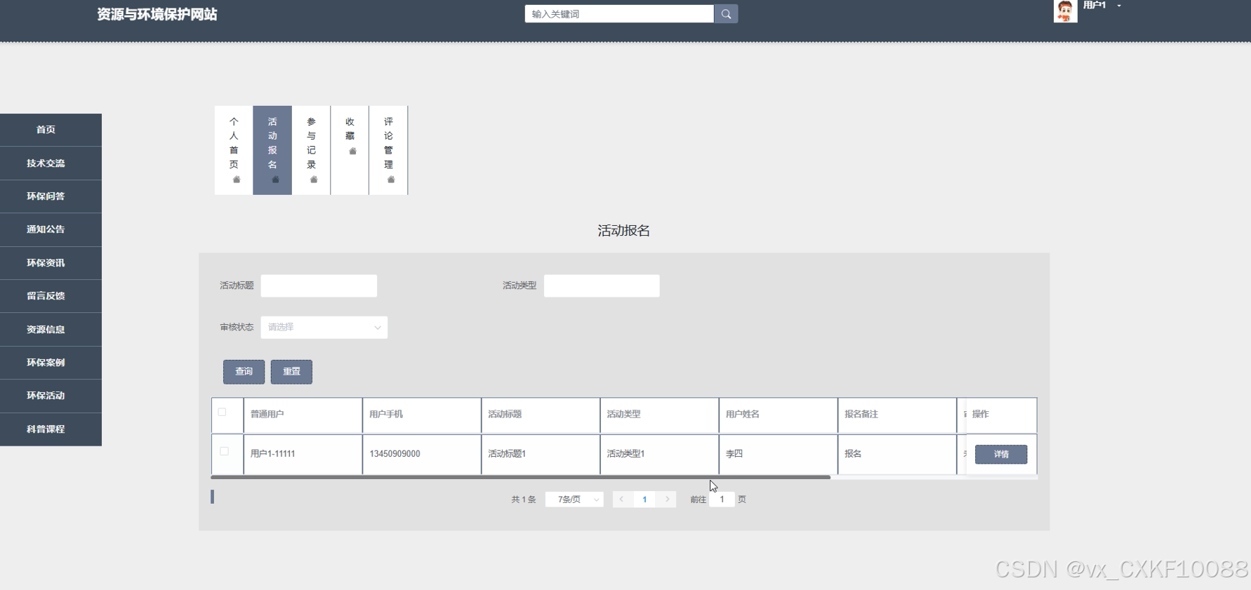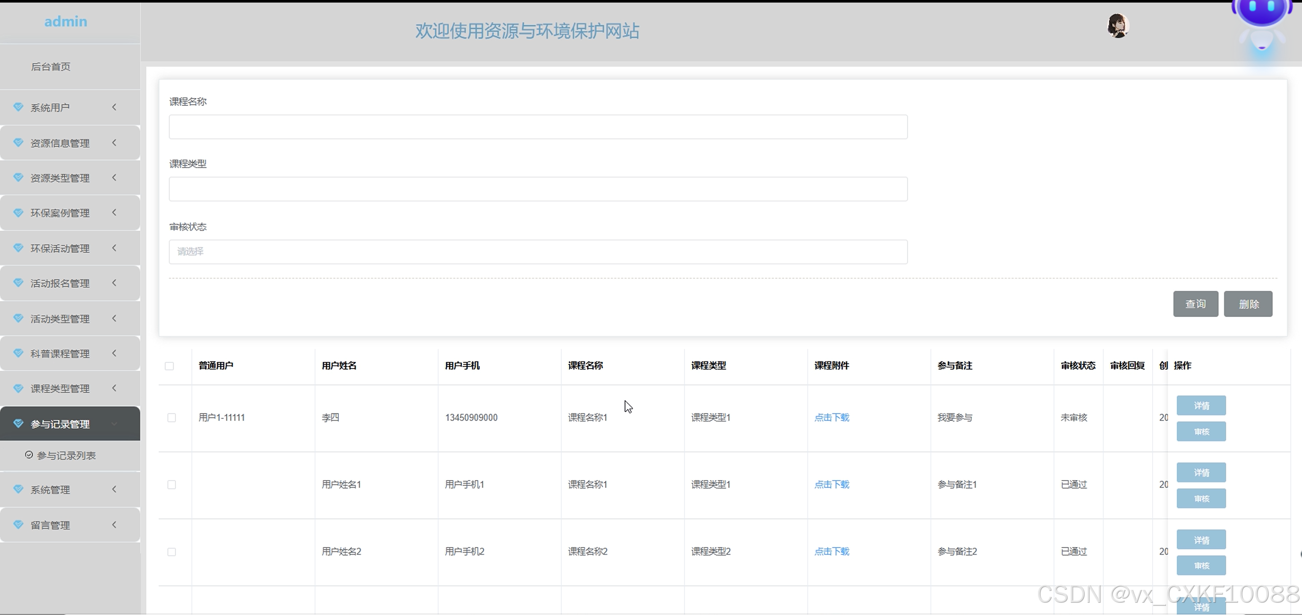 参与记录管理界面为管理员提供了对用户参与环保课程记录的管理功能。参与记录列表展示了用户的课程参与情况,包括课程名称、课程类型和审核状态等信息,方便管理员查看每个用户的参与记录。查询作用允许管理员根据课程名称、类型或用户信息进行筛选,快速查找相关参与记录。删除作用提供了删除无效或错误记录的选项,确保数据的准确性和更新。对于每个课程记录,管理员可以通过课程附件点击下载功能,下载相关的课程材料或附件,供进一步审核或存档。详情功能允许管理员查看参与记录的详细信息,包括用户参与的具体情况。最后,管理员可以进行审核操作,确认用户参与记录的真实性和合规性,确保课程管理的质量。参与记录管理界面如下图所示。