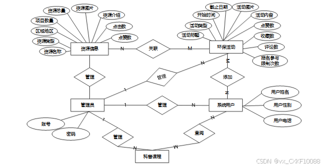E-R图概念设计通过抽象化的方式描述了资源与环境保护网站的数据结构和实体之间的关系。设计中涉及的主要实体包括“普通用户”、“管理员”、“活动”、“资源信息”、“环保案例”、“科普课程”、“评论”、“留言反馈”等。实体之间的关系如普通用户报名活动、发表评论、参加科普课程,管理员管理系统用户、资源信息、活动和课程等。每个实体的属性,如用户的个人信息、活动的时间和类型等,都被明确标识。E-R实体关系图如下。