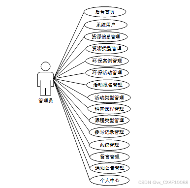 管理员用例图展示了管理员在资源与环境保护网站上的重要管理和运营职责。管理员通过后台首页管理系统的各项功能,包括用户管理、资源信息管理、环保活动和案例管理、科普课程管理等。管理员还负责活动报名、评论管理、留言反馈和通知公告的发布与管理。此外,管理员可以进行系统设置、权限管理及数据备份等工作,确保平台的顺利运行和内容的更新。用例图突出了管理员在确保系统安全、内容管理和用户服务方面的核心角色。管理员用例图如下所示: