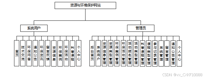 本资源与环境保护网站分为普通用户和管理员两大模块。普通用户模块包括首页、技术交流、环保问答、通知公告、环保资讯、留言反馈、资源信息、环保案例、环保活动、科普课程和个人中心(个人首页、活动报名、参与记录、收藏、评论管理),旨在提供全面的环保信息和互动平台。管理员模块则涵盖后台首页、系统用户管理、资源信息管理、环保案例管理、环保活动管理、科普课程管理等功能,确保系统的高效运行和内容更新。通过这些功能模块的设计,系统不仅提升了环保信息的传播效率,还增强了用户的参与感,同时为管理员提供了便捷的管理工具。每个角色对应的功能模块如图所示。